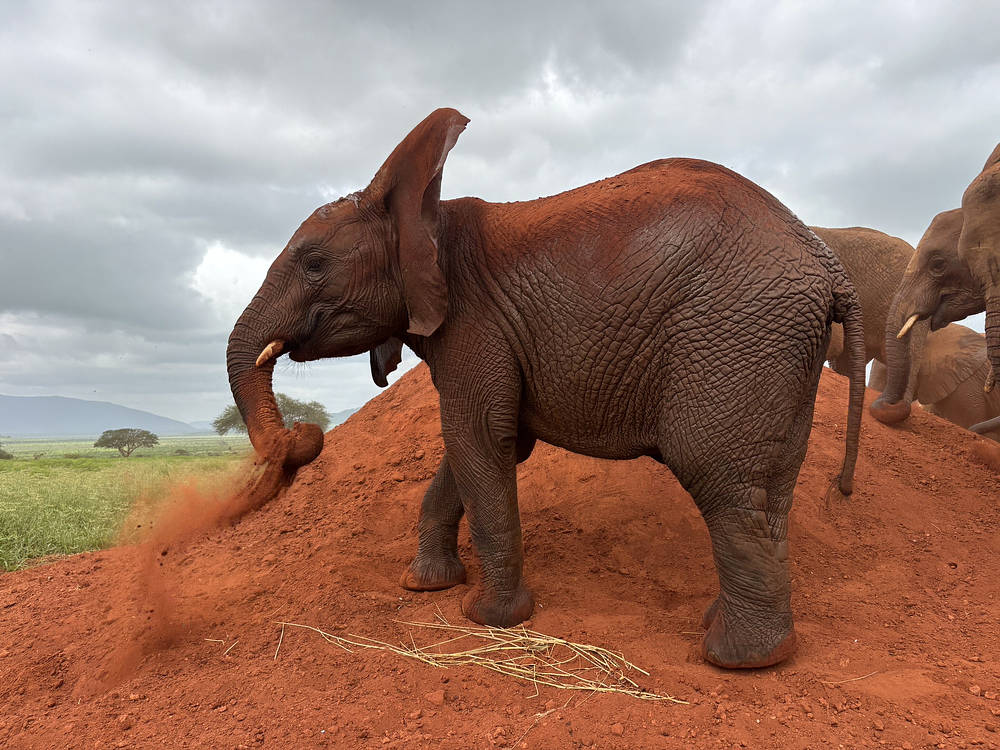 Il n'en va pas de même pour la petite Ashanti. Le collet d'un braconnier lui a coupé l'extrémité de la trompe, ainsi que les deux « doigts » que les éléphants d'Afrique utilisent pour manger et saisir des objets. Mais les éléphants sont très résistants - nous avons vu de nombreux éléphants sauvages prospérer avec une trompe coupée - et Ashanti s'est merveilleusement adaptée. Néanmoins, Mbegu estime manifestement qu'Ashanti mérite un peu plus de surveillance, car elle se tient debout, protectrice, pendant que la plus jeune femelle s'agenouille pour ramasser des boulettes dans sa bouche, en veillant à ce qu'aucun mâle turbulent ne se mette en travers de son chemin. (Nous admirons la vigilance de Mbegu, mais elle n'est pas nécessaire : Ashanti est tout à fait capable de s'occuper d'elle-même. En fait, nous la voyons souvent essayer effrontément de voler les bouteilles des autres orphelins directement dans leur bouche).