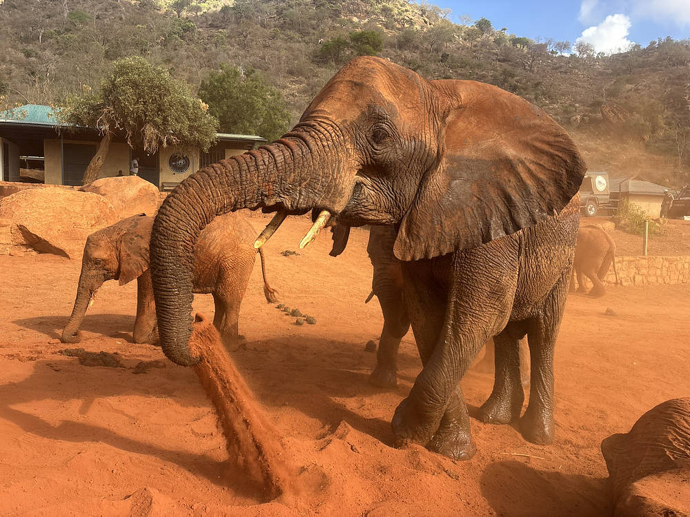 Naipoki est restée un moment pour montrer son petit bébé. Mbegu, l'ancienne matriarche du troupeau de Voi, jouait le rôle de nounou et restait très proche du petit Nsimba. Imperturbable face au bébé et refusant de le laisser perturber sa routine, Losoito a continué à prendre son bain de poussière matinal habituel.
