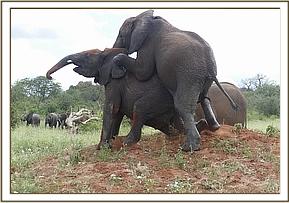 Une partie du groupe d’Olare est revenue aux palissades après une longue absence et d’autres comme Kilaguni ont décidé de rester dans le secteur. Il y avait Melia, Tumaren, Kibo, Kandecha, Kitirua, Kalama, Chemi Chemi. Kilaguni et Kanjoro, la paire sans queue, se sont rendus ensemble au bain de boue chaque jour et ont joué longuement dans l’eau, bien après que les autres orphelins soient partis.