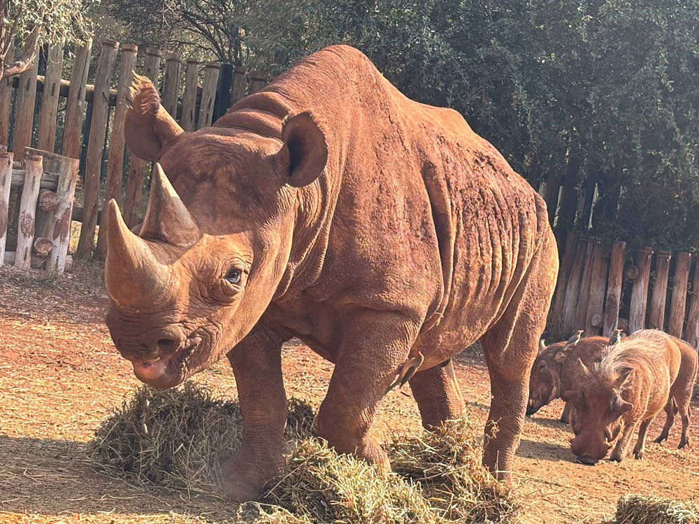 Tout le monde est extrêmement protecteur envers leur grand ami rhinocéros. Rompant avec leur routine, les phacochères ont rendu visite à Maxwell très tôt un matin. Max se reposait encore sur son lit de paille et les éléphants étaient encore dans leur enclos lorsque les visiteurs sont arrivés. Les cochons ont commencé à se battre, ce qui a réveillé Max. Il a essayé de séparer les phacochères, mais ils étaient complètement enchevêtrés et aucun des deux ne voulait s'arrêter. Entendant le vacarme, Taroha, Kamili, Wamata, Olomunyak et Nyambeni se sont agités et ont commencé à barrir et à pousser leur tête contre les portes. Lorsque nous avons ouvert leurs portes quelques minutes plus tard, Max avait chassé les phacochères qui se battaient et mangeait paisiblement des granulés avec la femelle restante. Néanmoins, les cinq éléphants se sont dirigés directement vers sa porte pour vérifier que tout allait bien !