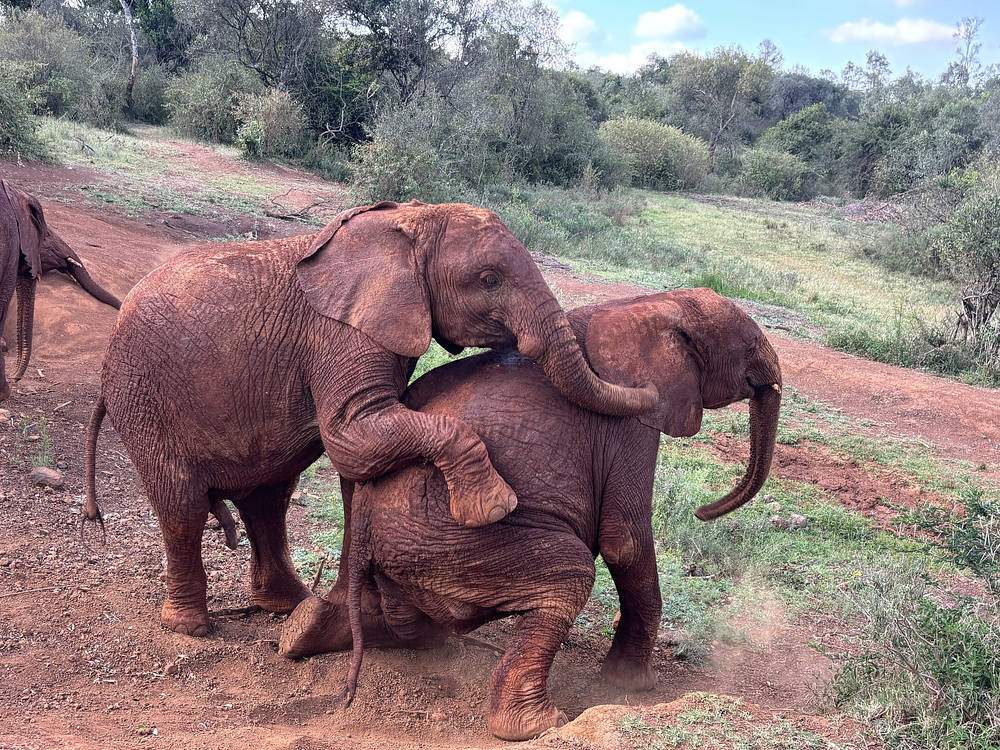 Certains jours, les orphelins se réveillent d'humeur contagieuse. Un matin, Mzinga a lancé la fête. Sans raison apparente, elle s'est mise à barrir dans son enclos. Dès que nous avons ouvert sa porte, elle s'est mise à courir dans l'enclos, réveillant les autres. Bientôt, tout le monde barrissait et criait. Mzinga s'est engagée sur le chemin, suivie par Latika qui courait à toute vitesse et beaucoup d'autres. Ils ont dépassé Max, qui se tenait debout devant sa porte, la tête haute, attendant qu'on le salue. Mais ce jour-là, personne n'a même ralenti en passant devant le grand rhinocéros — ils avaient une mission mystérieuse à accomplir !