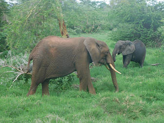 Un autre jour, nous avons eu une très heureuse réunion avec Kiombo. Il était parti depuis longtemps avec ses amis sauvages, mais après l'arrivée de la pluie, Kiombo a décidé qu'il était temps pour lui aussi de revenir. Nous avons vu que Murera était heureuse de le voir : elle secouait ses pieds et tournait sa trompe en signe de salut.