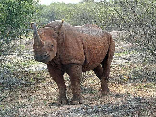Les rhinocéros noirs adorent leurs routines — et Chamboi est un excellent rhinocéros noir. Il commence chaque matin par boire longuement à cet abreuvoir précis. Une fois qu’il se sent suffisamment hydraté, il s’enfonce dans la brousse pour une journée d’exploration avec ses gardiens. Nous ne pouvons pas précipiter ce rituel, et nous ne le ferions pas de toute façon.