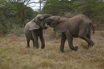 Vers le milieu du mois, un jeune mâle adulte — à peu près de la même taille que Mwashoti — a décidé de rejoindre les noctambules. Les gardiens ont plaisanté en disant qu'il avait décidé qu'il était lui aussi un orphelin et qu'il voulait être adopté par nous ! Il s'est discrètement intégré au troupeau des orphelins. Bien qu'ils se soient naturellement montrés prudents en sa présence, ils l'ont trouvé calme et bien élevé, comme s'il comprenait comment les choses fonctionnent à Umani.
