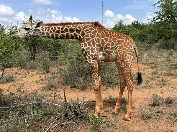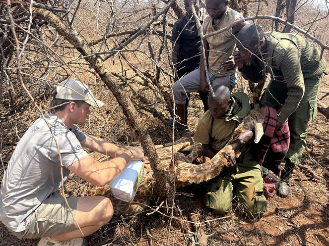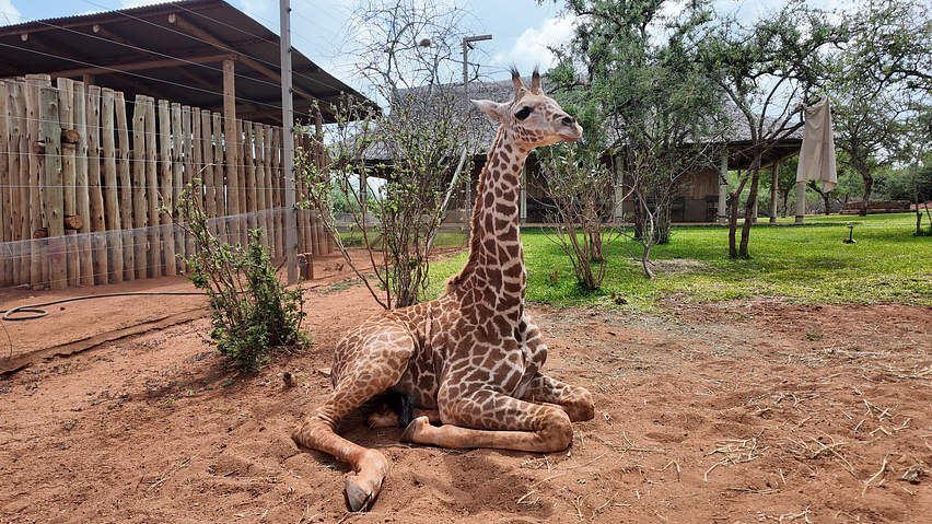 Le 5 septembre 2025, une girafe orpheline a été signalée à quelques kilomètres de notre siège social à Kaluku. Elle avait été observée seule pendant plusieurs jours, venant discrètement s'abreuver à un abreuvoir avant de se fondre à nouveau dans la brousse. Nous avons reçu d'autres signalements concernant cette girafe potentiellement orpheline, mais elle a disparu avant que nous puissions enquêter. Puis, notre unité canine SWT/KWS, qui effectuait une patrouille d'entraînement, a croisé la jeune girafe, toujours seule. Grâce à leurs compétences en matière de pistage, ils l'ont surveillée discrètement pendant toute la matinée afin de vérifier si sa mère se trouvait à proximité. Pour confirmer définitivement sa situation, Taru Carr-Hartley a alors survolé la zone en hélicoptère et n'a trouvé aucune autre girafe dans les environs. (Nous avons découvert plus tard le corps d'une girafe adulte qui avait été tuée par des lions. Il s'agissait sans doute de la mère de l'orpheline.) La jeune orpheline vivait déjà sur du temps emprunté — c'était un miracle qu'elle n'ait pas été tuée par les lions. Nous devions la sauver avant qu'elle ne disparaisse à nouveau. Cependant, c'était une véritable mission : elle était incroyablement rapide, déterminée à nous échapper, et sa taille et sa couleur lui permettaient de se camoufler parfaitement. L'équipe a frôlé plusieurs fois la catastrophe, mais elle a réussi à s'échapper à chaque fois. À ce stade, plusieurs heures s'étaient écoulées et le temps pressait : l'hélicoptère devait faire le plein et il serait impossible de la retrouver dans la brousse dense sans soutien aérien. Nous avons décidé de tenter une dernière fois notre chance. L'hélicoptère l'a dirigée vers une zone dégagée. Roan Carr-Hartley a bondi et, d'un seul coup, a réussi à attraper la jeune girafe insaisissable. Le reste de l'équipe l'a rattrapée et, ensemble, ils l'ont amenée au sol et l'ont sécurisée pour la sauver. Nous l'avons appelée Pips. Ce fut une matinée marathon pour tout le monde, surtout pour Pips. Cela faisait probablement plusieurs jours qu'elle n'avait pas bu de lait, et nous ne pouvons qu'imaginer à quel point elle devait être stressée en essayant de se protéger toute seule. Les manœuvres d'évasion de la journée l'avaient encore plus épuisée. Nous l'avons installée à l'arrière d'un camion et l'avons rafraîchie avec de l'eau pendant le court trajet jusqu'à aluku.